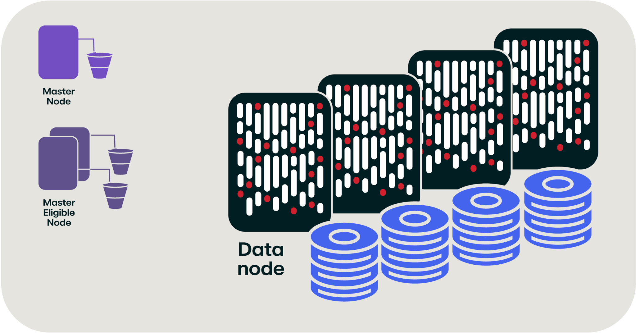For this example, it’s easier to talk specifics instead of abstract concepts—let’s say we’ve got an OpenSearch cluster that holds 105 terabytes of data. For starters, OpenSearch isn’t just one computer; it’s several of them networked together to provide fast access to data stored across all of them. In this architecture, you have a master node and several master-eligible nodes to provide a high-availability control plane to your database; these don’t hold data, but they’re managing all the other computers that are part of this OpenSearch cluster. Then you’ve got some large computers to manage all of the data; for a 105 terabyte cluster, you’d have 12 nodes with 32 cores and 256 gigabytes of memory as well as nine terabytes of disk storage per node.