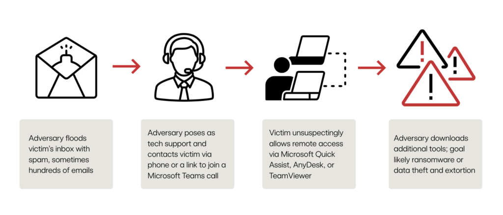 - It begins with flooding a victim’s inbox with hundreds of spam emails. Note: It is not uncommon for multiple users in the same environment to be targeted simultaneously.