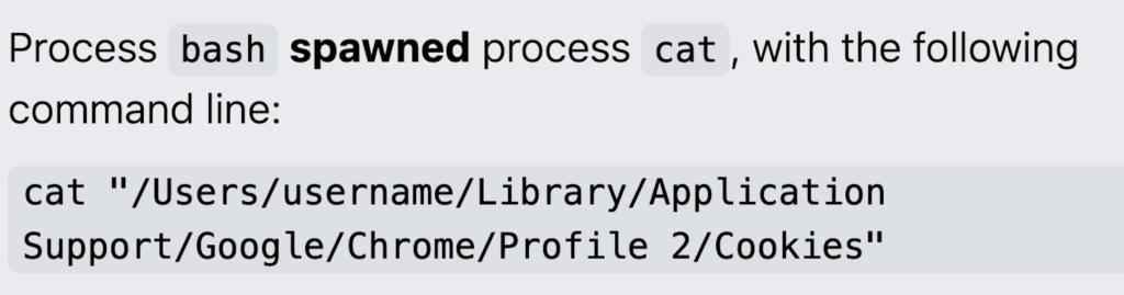 It will attempt to gather credentials, payment card data, keychain details, and cryptocurrency wallets. In the example below, MacSync copied an affected user’s macOS keychain using cat—a command-line utility in macOS for concatenating and displaying file contents—along with Chrome web session cookies, and exported the data.