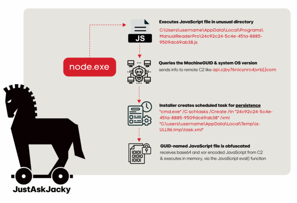 | Month's rank: ⬆ 1 | Threat name: JustAskJacky | Threat description : Family of malicious NodeJS applications that masquerade as a helpful AI or utility tool while conducting reconnaissance and executing arbitrary commands in memory in the background |