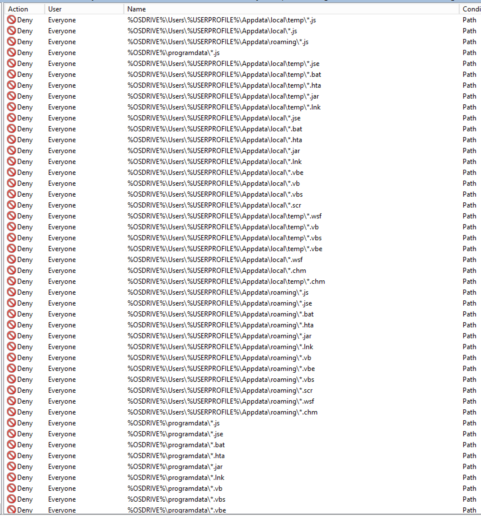 Applocker can also be specific to the file extension being blocked. In this case, I have highlighted the following extension types that should not execute out of the 5 locations above: