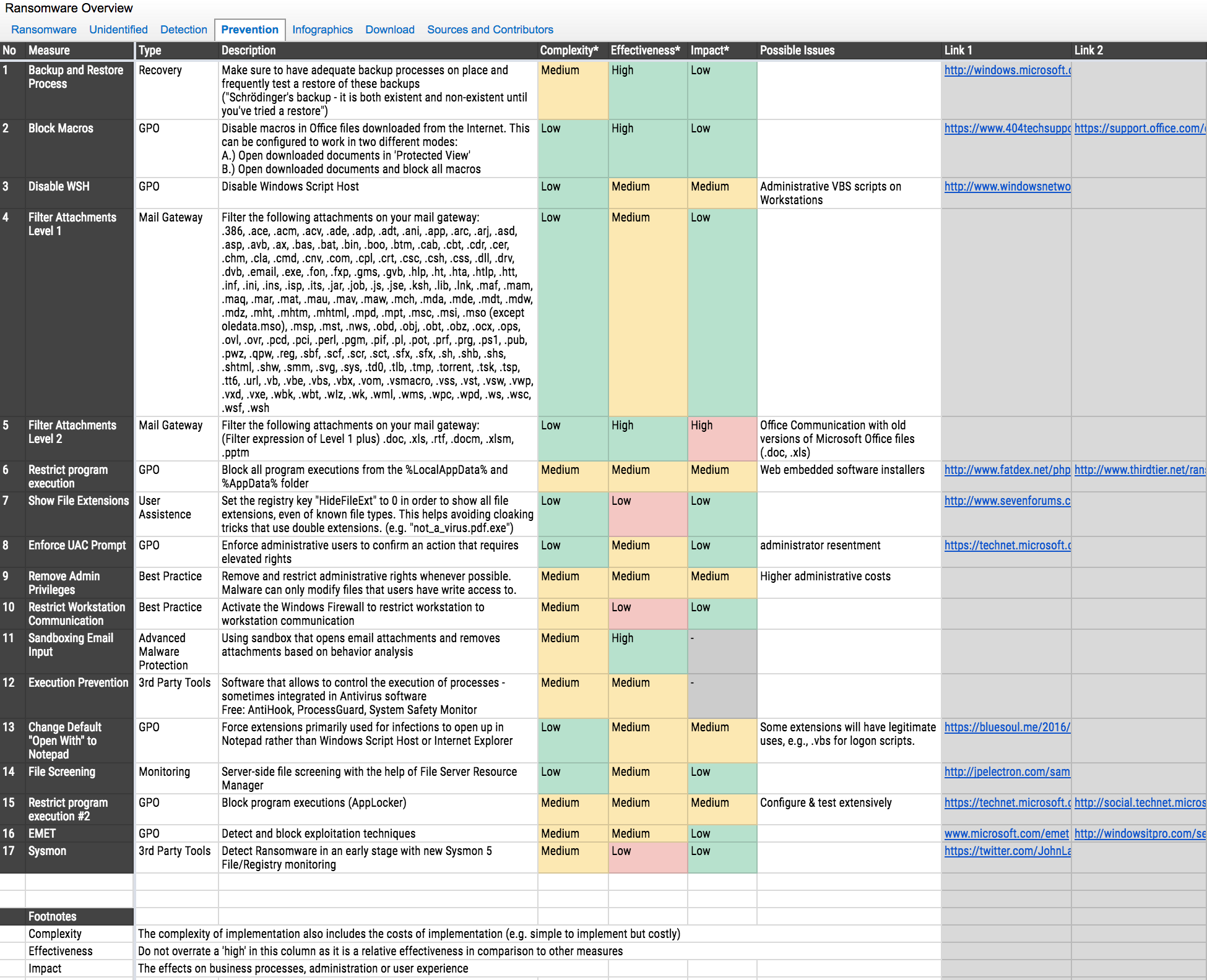 During our recent webinar on the ransomware epidemic, I referenced 17 different ways to assist with preventing ransomware. This list was generated by many contributors in the industry who, just like us, are battling ransomware. These techniques all play a part in your defense-in-depth program. I highly recommend reviewing the following spreadsheet and impact matrix to make a decision on what next steps may be best for your organization.