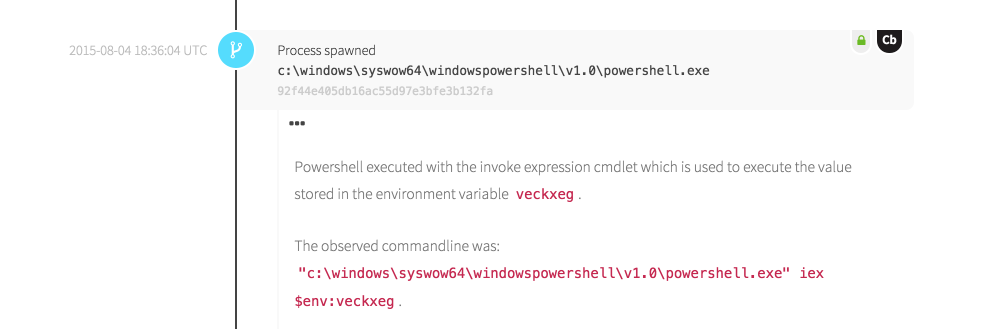 The product of this encoded routine is a Powershell child process used to execute a script using iex, an alias for the Invoke-Expression cmdlet. The iex cmdlet takes the next bit of input, a command that is stored in an obscure environment variable, and executes it. What we see coming from the Carbon Black sensor is: